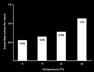 The image below shows sweat rate data when wearing shorts and T-shirt during moderate intensity exercise conducted in different environmental temperatures. It highlights the typical sweat rate response in a group of male recreationally active individuals. We can see that as ambient temperature rises there is also a rise in the sweat rate per hour (no surprises there), but it should be noted that even at cold (4°C) and cool (11°C) ambient temperatures sweat rate can be in the region of 0.5 to 0.6 Litres per hour. These values in the cold (4°C) and cool (11°C) conditions will be higher if more clothing is worn, so with your winter clothing on you could easily reach the sweat rates reported for 21°C or more. It should also be pointed out that these are average data from a group of males. Individuals can have quite different sweat rate responses so it is best to find out your own sweat rate at different temperatures.